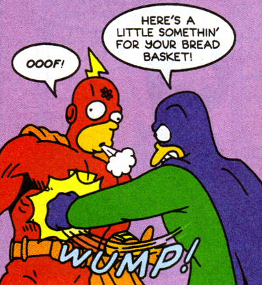 In the Simpsons TV universe, action figure Radioactive Man has a villain named Mister Kidney Punch, who specializes in, unsurprisingly, delivering a punch to the kidneys. According to the Radioactive Man wiki, he works alongside the Scarlet Floozy and the Human Lawn Dart in a group called the Threatening Threesome. Perhaps Mister Kidneys and Mister Kidney Punch are...one and the same!!